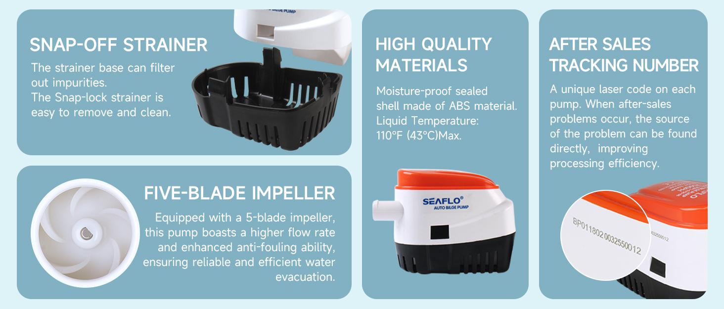 All-in-one pump & switch-No float switch required Pump turns on when water level rises & shuts off when water is removed